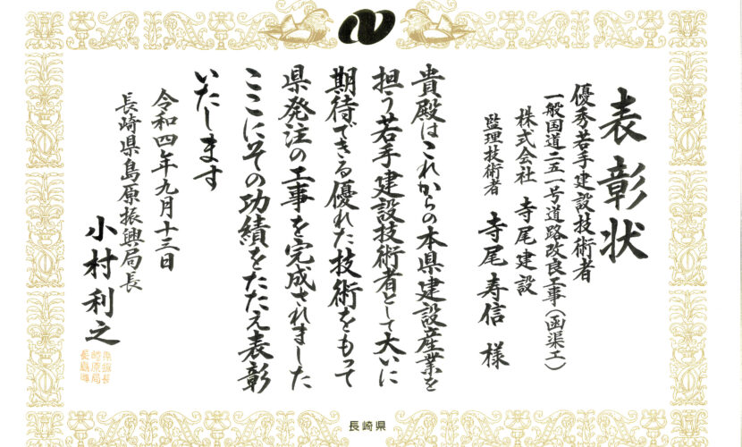 令和4年9月13日【長崎県島原振興局長(優秀若手建設技術者表彰)】受賞しました