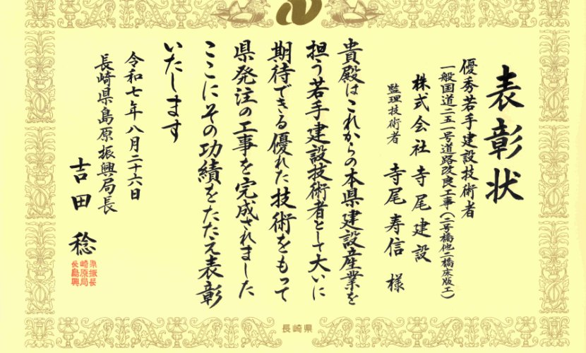 長崎県島原振興局より「令和7年度 優秀若手建設技術者表彰」を受賞しました。