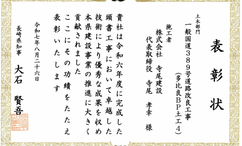 当社施工の【一般国道389号道路改良工事(多比良BP土工4)】が県知事表彰を受賞しました。