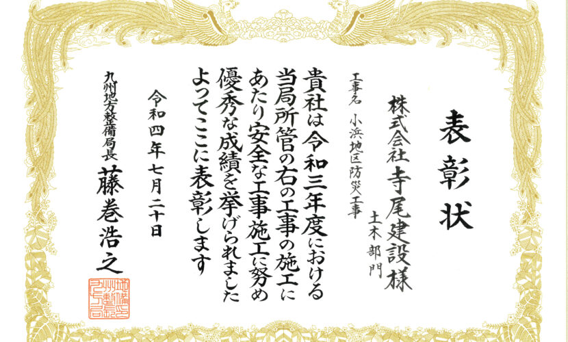 令和4年7月20日【九州地方整備局国土交通行政功労表彰(安全施工業者)】受賞しました