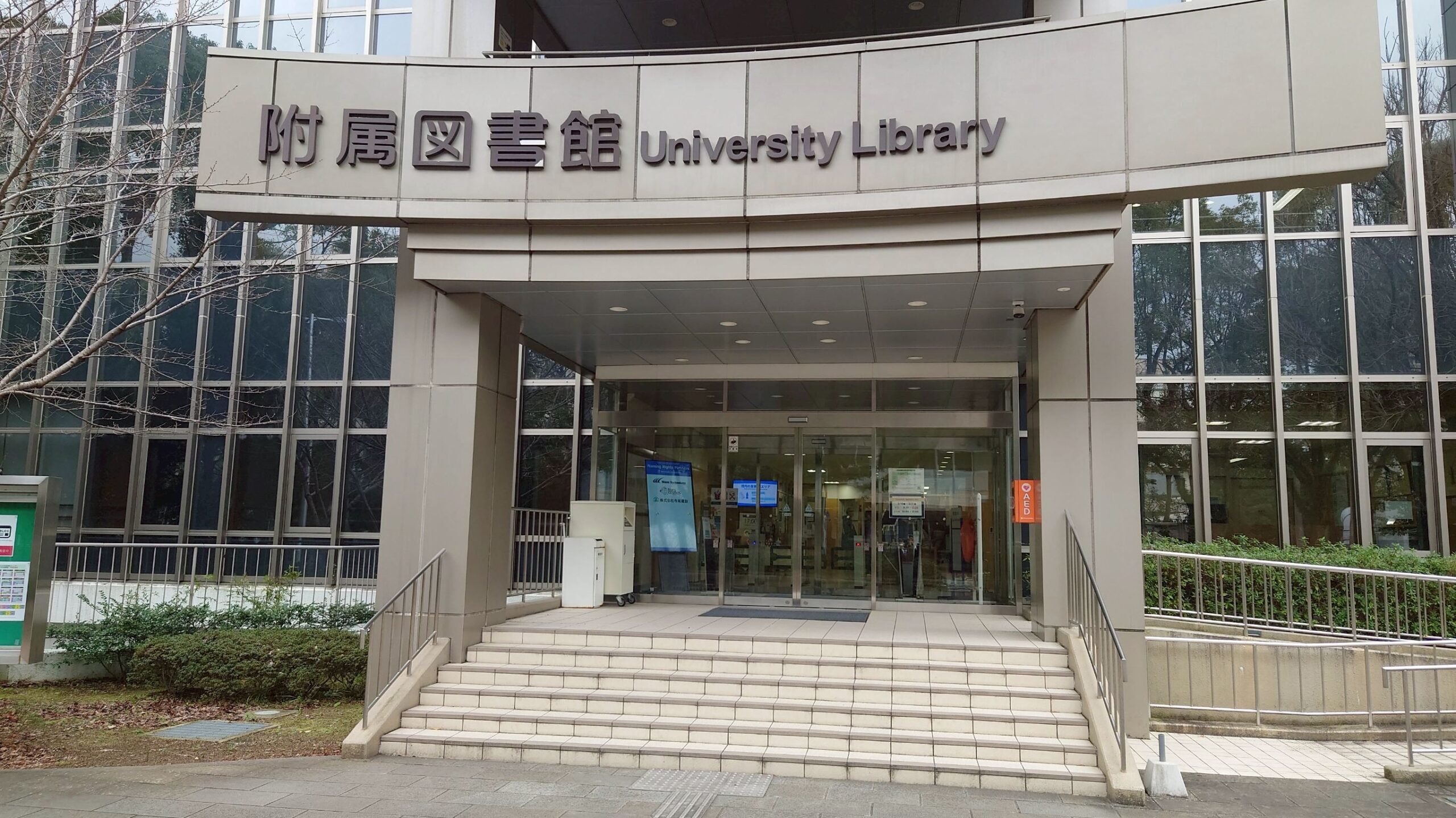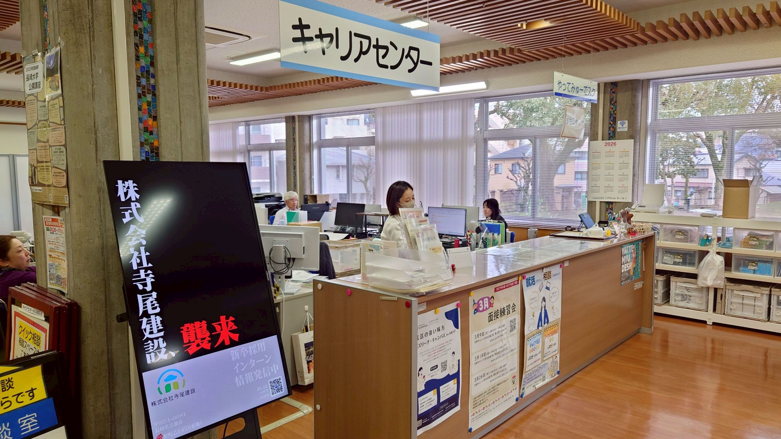 デジタルサイネージは大学構内のキャリアセンター窓口、食堂、付属図書館出入口に設置してあります。